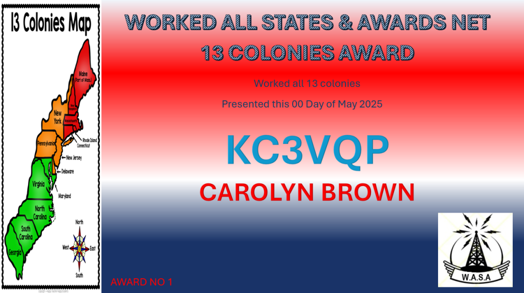Criteria: Made at least one contact with a station in each of the 13 Original Colonies during one or more of the WASA Nets.