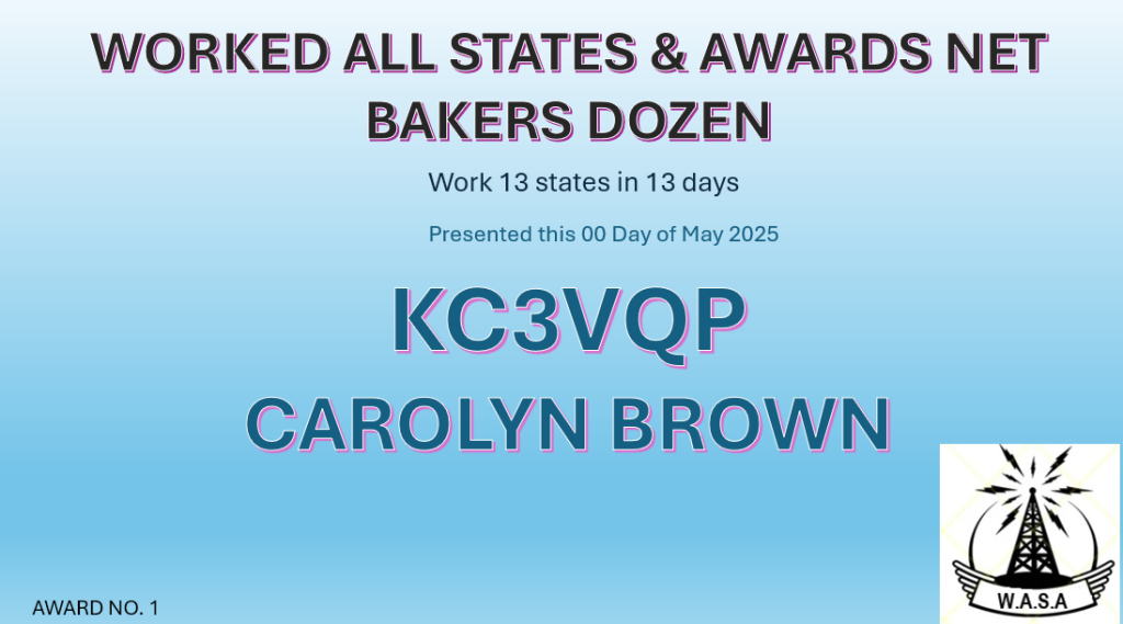 Criteria: Made at least one contact with a station in 13 different states in a 13 day period during one or more of the WASA Nets.