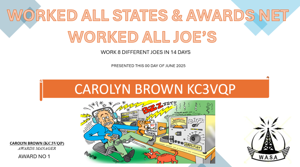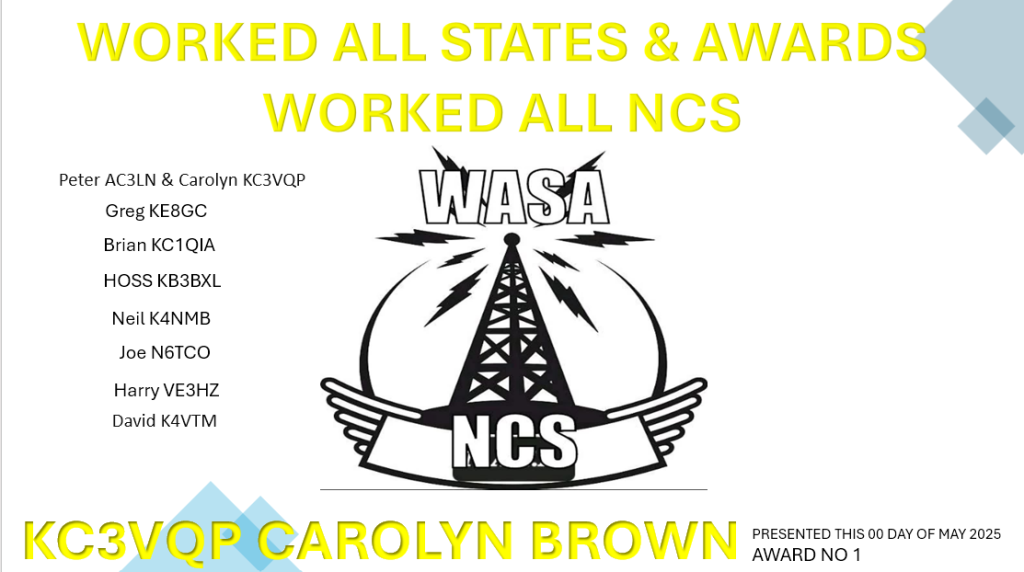 Criteria: Made at least one contact with a minimum of 10 designated WASA Net NCS stations. Endorsements will be given for each additional 10 WASA Net NCS stations worked