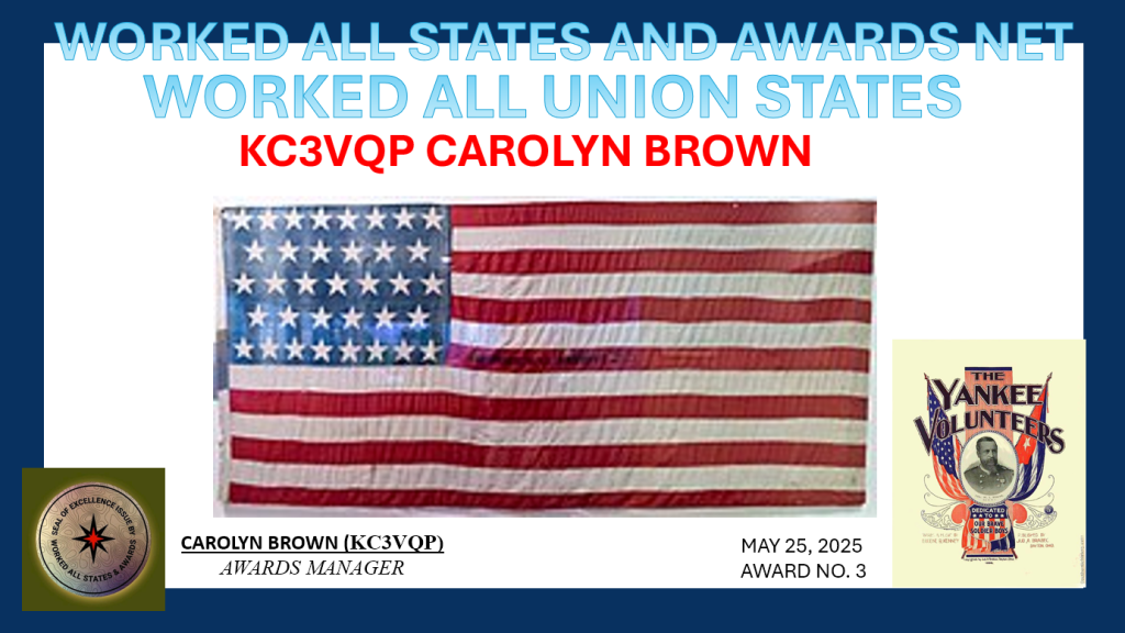 Criteria: Made at least one contact with a station in each of the 48 continental states during one or more of the WASA Nets. (Endorsements for AK or HI)