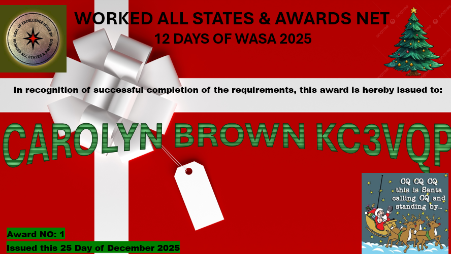 Criteria: Make at least one contact on a WASA Net on each day for 12 Days each with a different operator (between Dec 24th and Jan 24th).